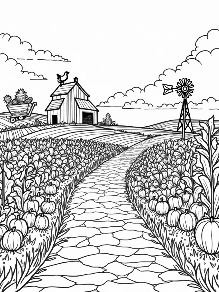 Imagine all the colors you can use! Bright yellow for the sunflowers, deep greens for the kale, and vibrant oranges for the pumpkins. You can even add your own twist with the barn and clouds. Get creative and let your imagination run wild!