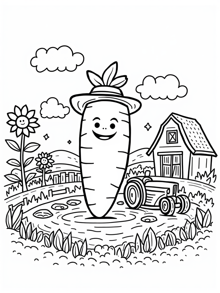 This scene brings to life a delightful farm with a giant, smiling carrot wearing a straw hat right in the center. It’s hard not to smile back at that cheerful carrot! On one side, there’s a bright red barn surrounded by oversized sunflowers that look like they’re trying to reach the sky. They’re just so playful and full of life!