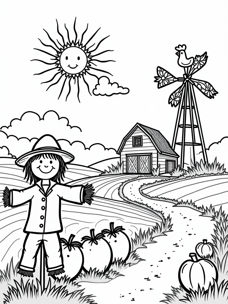 This delightful scene showcases a sunny farm landscape, where a giant, smiling sun watches over a patchwork of colorful fields. In the foreground, a friendly scarecrow with a straw hat stands proudly beside a row of oversized carrots and tomatoes, each sporting a happy face. It’s a cheerful sight that’s bound to make anyone smile!