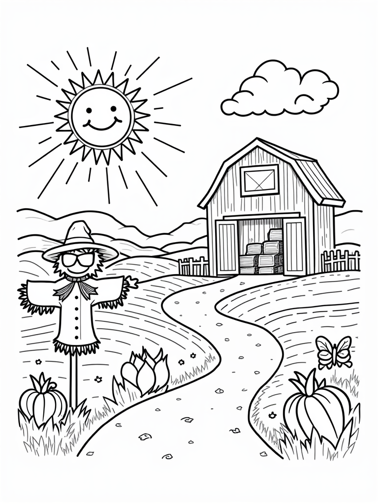 This coloring page showcases a sunny farm landscape that's bursting with color and personality! The giant sun is all smiles, wearing cool sunglasses while casting its rays over a patchwork of vibrant fields. You can't miss the cheerful scarecrow standing guard, sporting a cute straw hat and keeping an eye on the oversized carrots and pumpkins nearby.