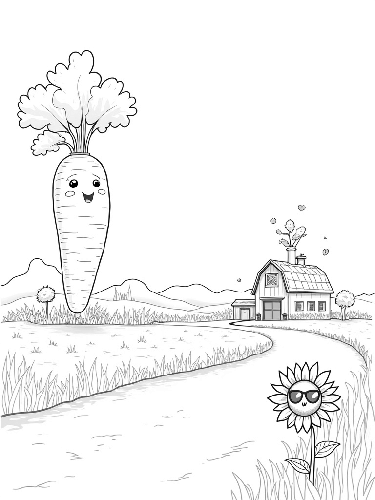 Check out this free, printable coloring page featuring a surreal farm landscape with a giant carrot and a cool sunflower! Perfect for kids who love to color and explore fun farm themes.