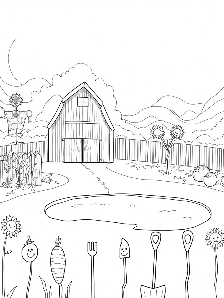 A winding dirt path leads to a serene pond, perfectly reflecting the barn and the swirling sky above. It’s a great spot to imagine fishing or just enjoying the view. And don’t miss the quirky garden tools in the foreground! Each one, from the fork to the spade, has its own unique designs that are just waiting for your colorful touch.