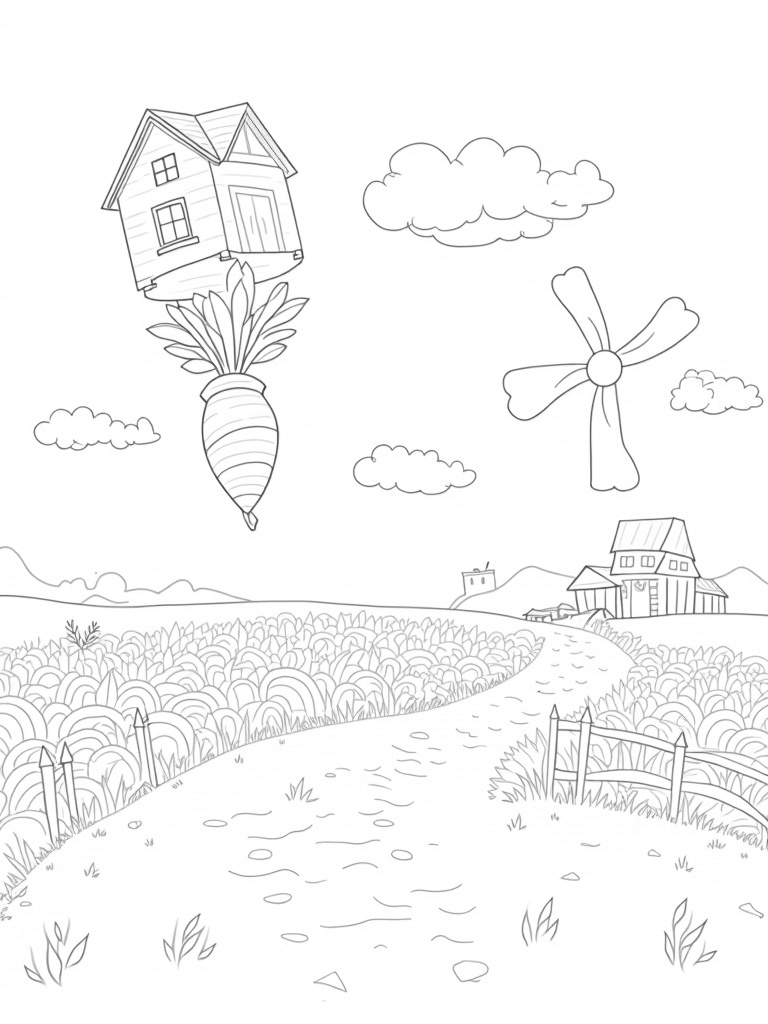 Look up! There’s a giant barn hanging upside-down from fluffy clouds, creating a fun twist on a typical farm scene. Below, oversized vegetables like a towering carrot and a spiraled potato are just waiting for your favorite colors. It’s like a garden that’s gone a little silly!