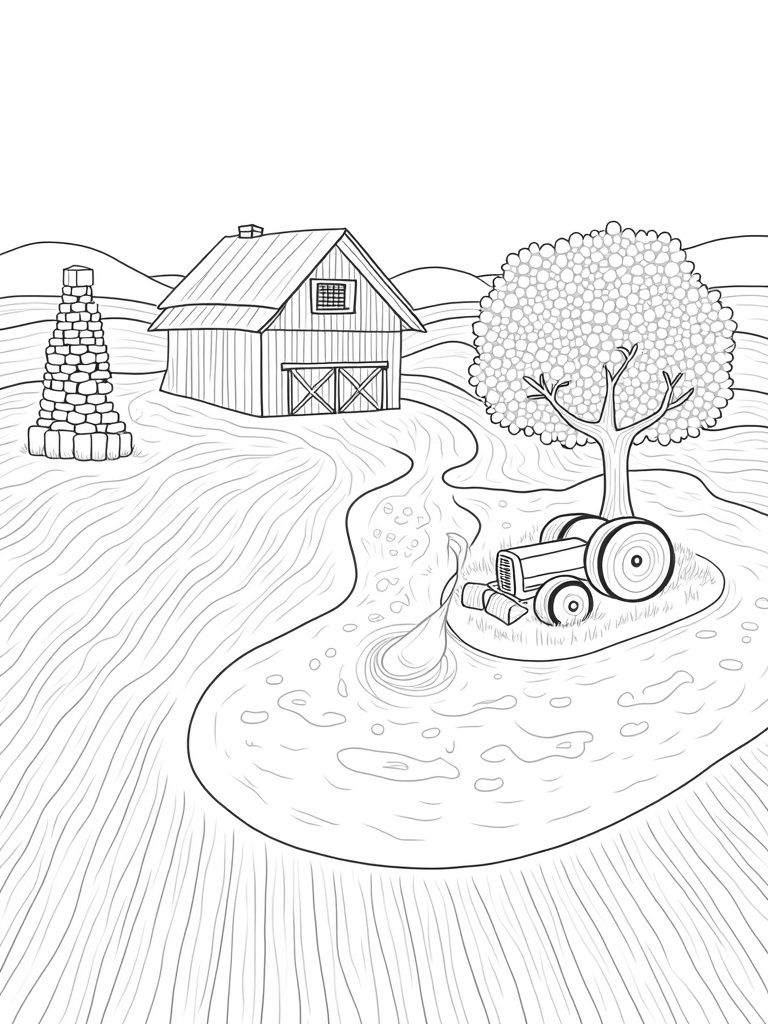 Look closely at the oversized watering can! It’s spilling streams of water that create little ponds reflecting the sky. These ponds are perfect for imagining tiny critters splashing around. Kids can have a blast coloring in all the different sections, letting their creativity run wild as they bring this vibrant farm to life!