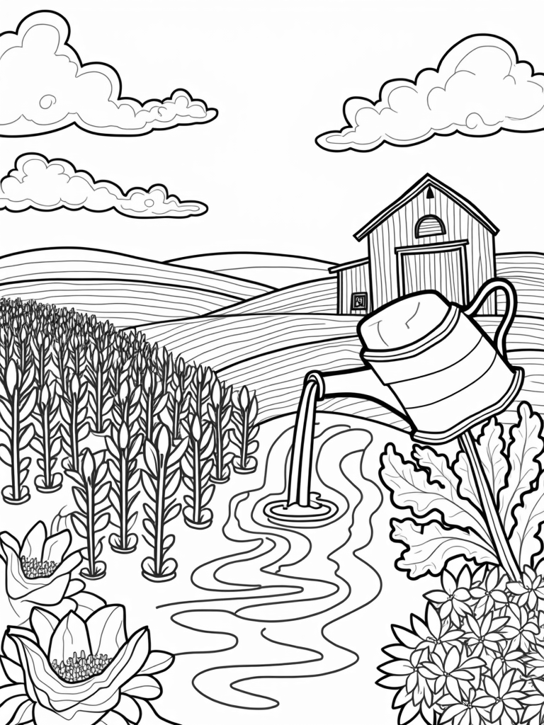 Vibrant Farm Landscape with Colorful Watering Can and Giant Carrot Coloring Page