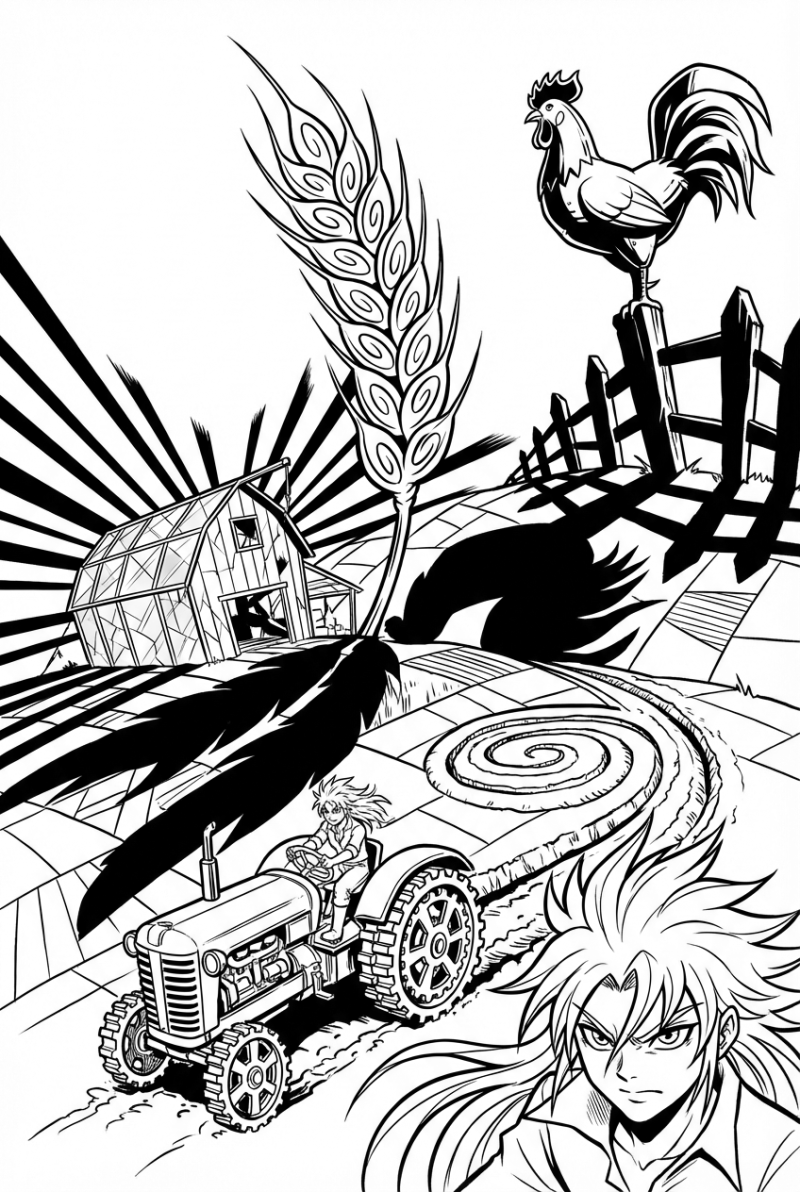 Look at that giant ear of wheat, standing tall like a lighthouse over a checkerboard field. Next to it the old red barn has turned into a sparkling glass prism, throwing sunrise beams in all directions. A vintage tractor rolls along a spiral furrow, but its wheels are made of interlocking gears that look ready to spin. Hovering above, a copper rooster perches on a rusted fence post, its silhouette stretching long shadows across the scene.