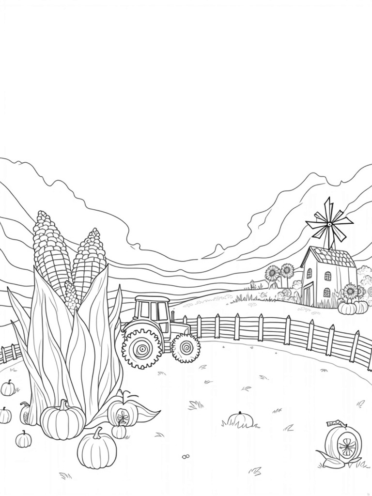 Whimsical Farm Landscape with Giant Corn Cob and Pumpkins Coloring Page
