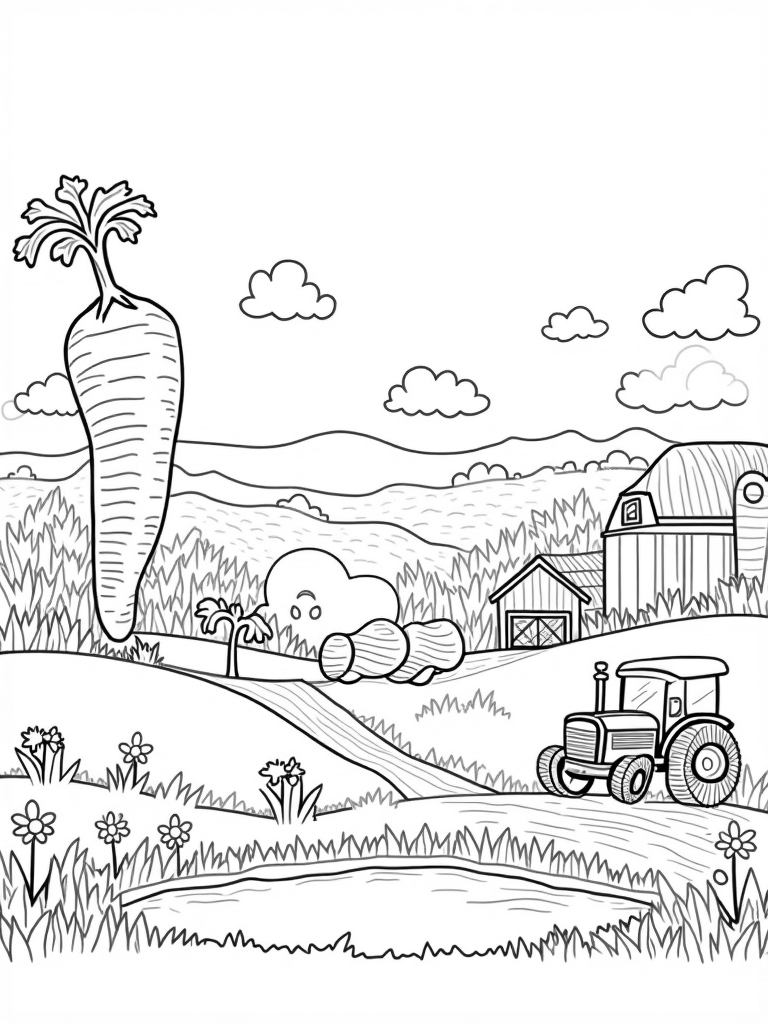 This delightful farm scene is bursting with oversized fruits and veggies that look like they're straight out of a storybook! Picture a giant carrot standing tall, offering a swing made from its green tops. Nearby, a colossal tomato rolls down a hill, leaving a colorful patchwork trail behind it. You can also spot a unique barn, with a spiraled roof crafted from woven wheat, adding a cozy touch to the landscape.