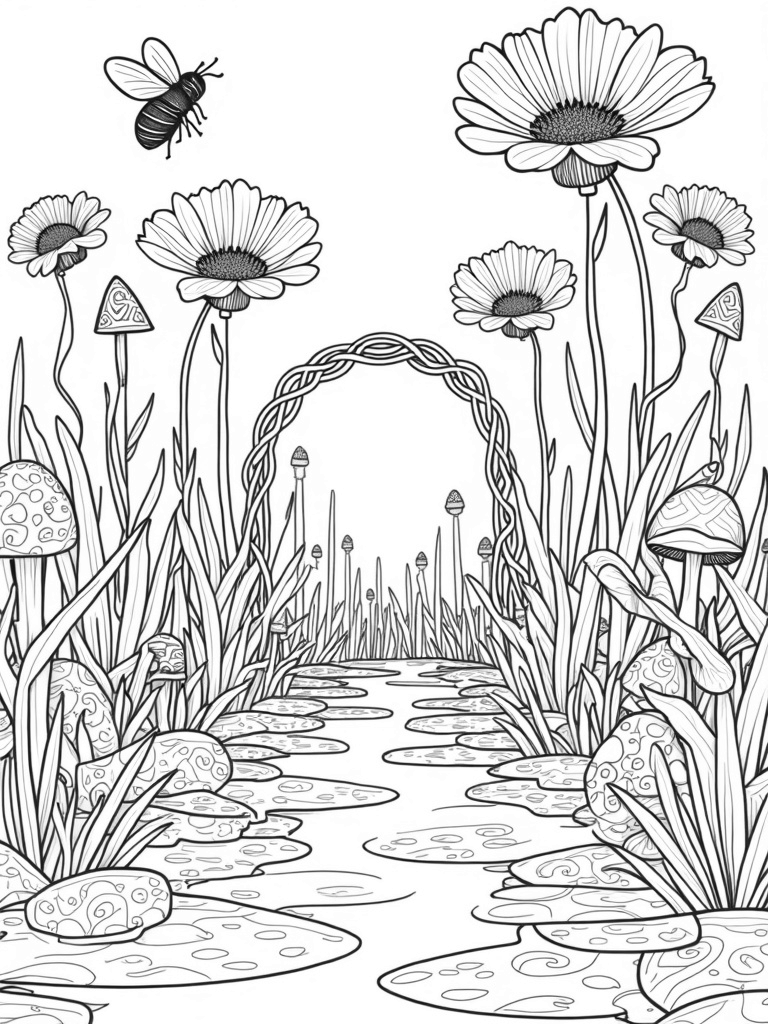 Check out this free, printable coloring page featuring colossal flowers, oversized bees, and a winding river! Perfect for kids who love flowers, this whimsical garden is just waiting for your favorite colors.