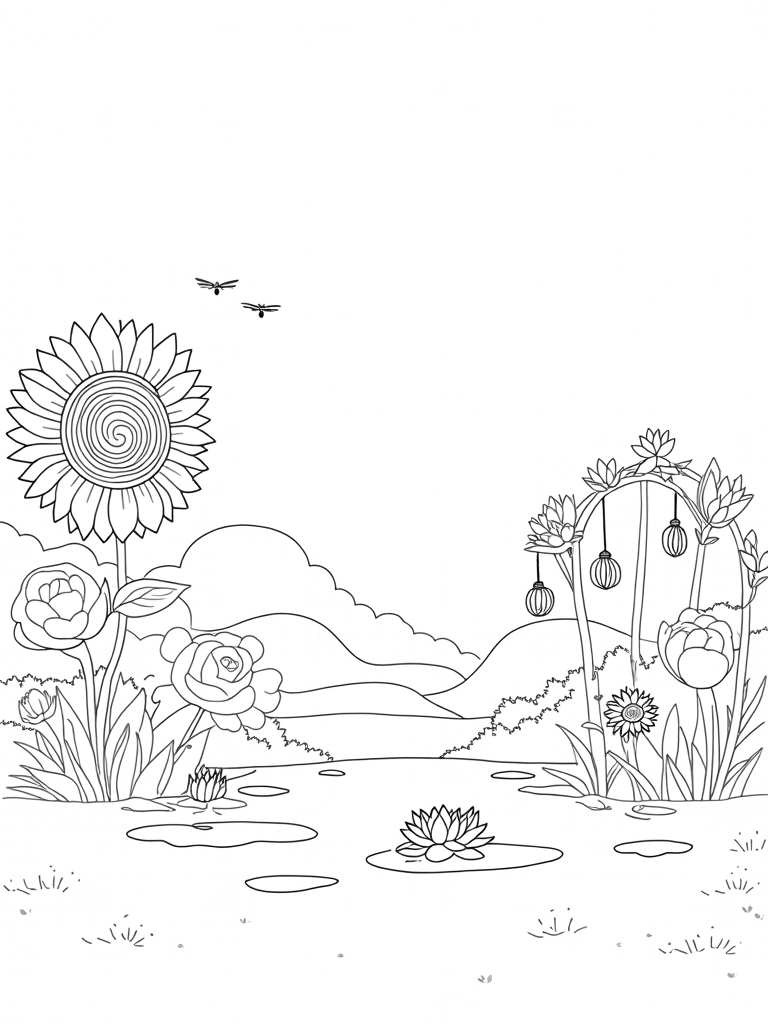 In this vibrant flower garden, oversized blossoms twist and spiral towards the sky, creating a magical atmosphere. Right in the center, there's a gigantic sunflower that looks like it's beaming sunlight with its swirling center and wavy rays. Nearby, you'll spot some lily pads gently floating on a serene pond, each one hosting a delicate dragonfly with beautifully patterned wings. Above, a whimsical trellis arches gracefully, covered in climbing vines and draped with lanterns shaped like blooming buds.