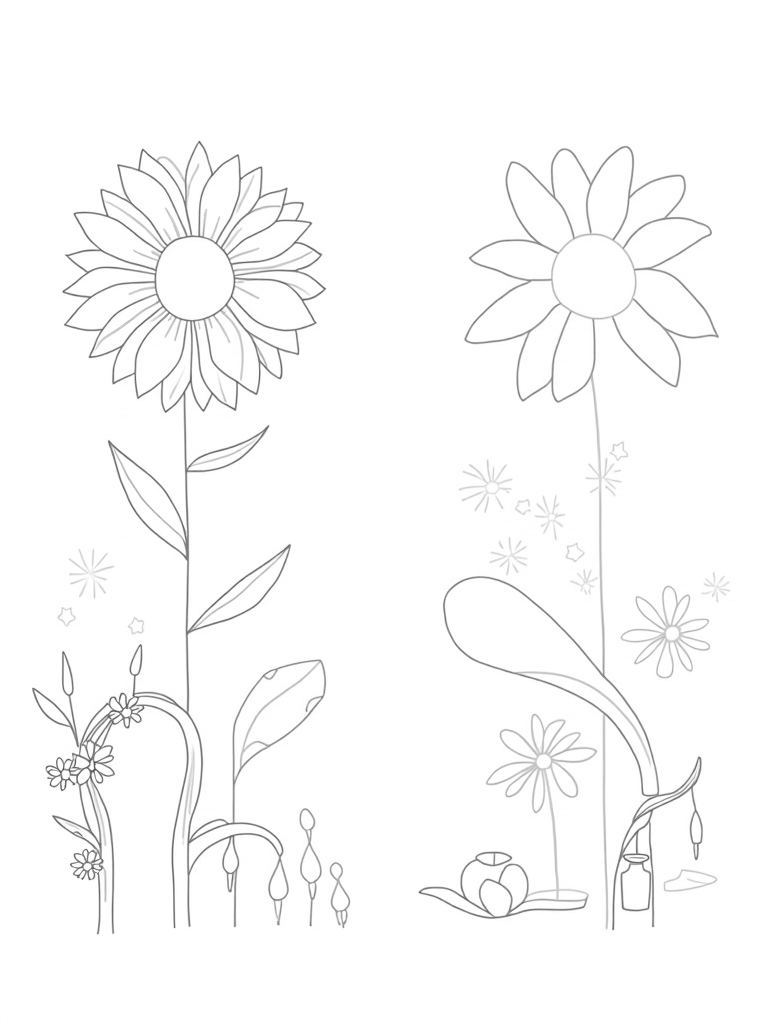 This delightful garden is bursting with oversized flowers that seem to dance with joy! There's a giant sunflower standing tall, its petals twisting out like a playful pinwheel. Just nearby, you'll find a cluster of tulips forming a colorful rainbow arch, each petal dressed in its own unique pattern. And don't miss the delicate dandelions floating around, their seeds magically turning into tiny stars!