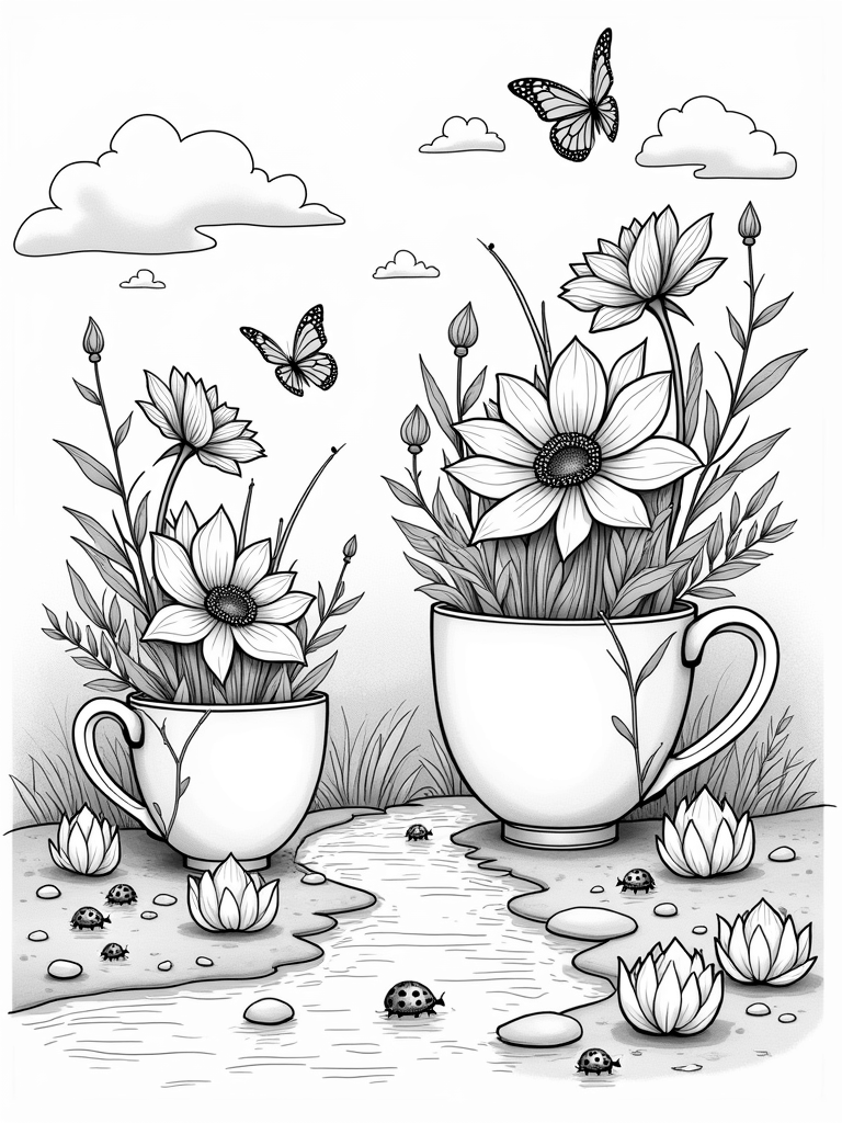 Imagine a garden where flowers are so big they sit on teacups! This coloring page shows vibrant, oversized blossoms perched on colorful cups, with twisting vines wrapping around the handles. The leaves and thorns add a bit of whimsy, creating a magical atmosphere.
