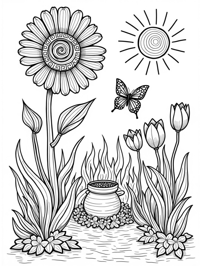 This coloring page is all about a magical garden filled with oversized flowers that are just waiting for your creative touch. At the center, a giant daisy stands tall, its spiral petals inviting you to add your favorite colors. Around it, a cluster of cheerful tulips forms a fun circular maze, perfect for little imaginations to explore.