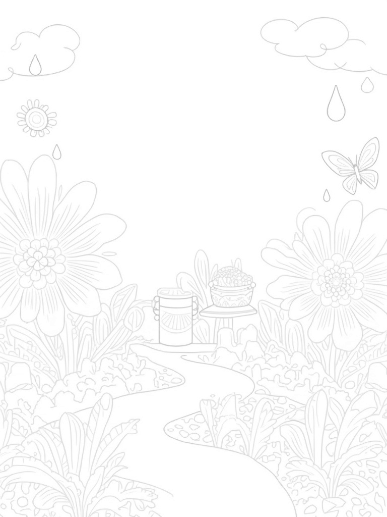This delightful scene showcases a magical garden filled with giant, floating flower petals that come in all sorts of shapes and patterns. Below these colorful blooms, a winding stone path invites you to stroll through the oversized ferns that add a lush, leafy touch. Right at the heart of this whimsical garden, an ornate watering can spills vibrant droplets that magically turn into fluttering butterflies!
