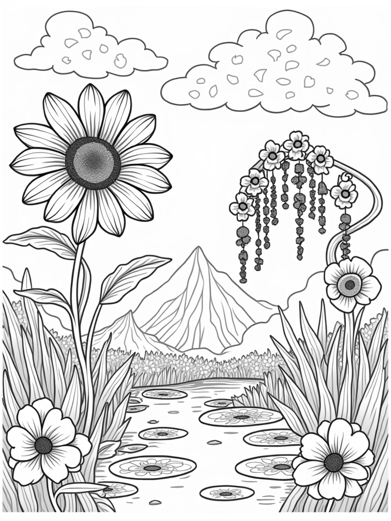This coloring page invites you into a magical garden where flowers of all shapes and sizes bloom. You’ll find a towering spiral sunflower next to a waterfall made of colorful petals, creating a vibrant scene. There’s also a twisting tree with delicate, lantern-like orchids hanging from its branches, adding a touch of elegance.