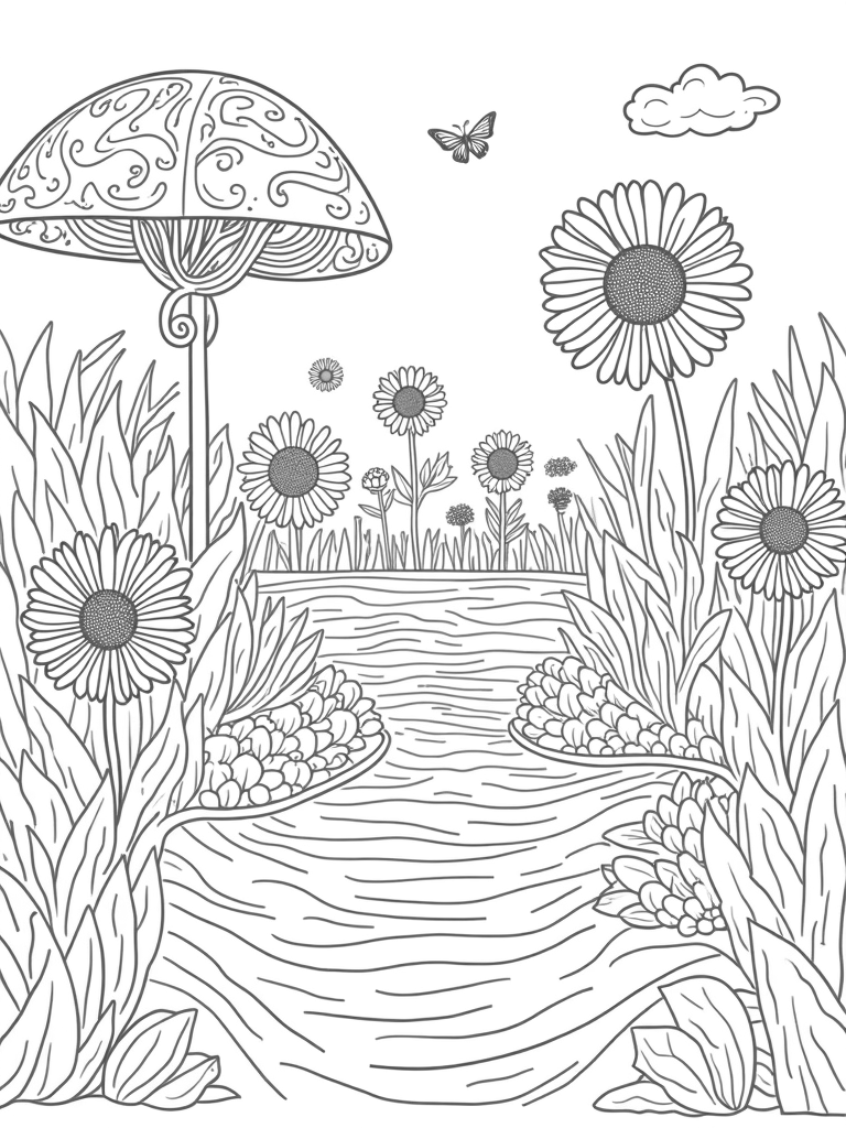 The garden is bursting with giant flowers that look like colorful umbrellas, each petal decorated with cool patterns just waiting for your favorite colors. Towering sunflowers twist and turn, their centers swirling like little galaxies, making it hard not to smile at their playful shapes. If you follow the winding pebble path, you’ll find a serene pond where water lilies float gracefully, looking like delicate saucers.