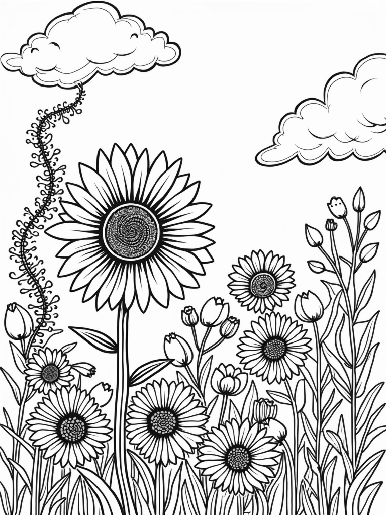 On the right side, a cluster of tulips resembles colorful paintbrushes, each dipped in a rainbow of bright hues. Imagine how much fun it would be to fill those flowers with your favorite colors! And above it all, wispy clouds shape-shift into flowers, casting gentle shadows that make the whole garden feel alive. Grab your crayons or markers and let your imagination run wild!