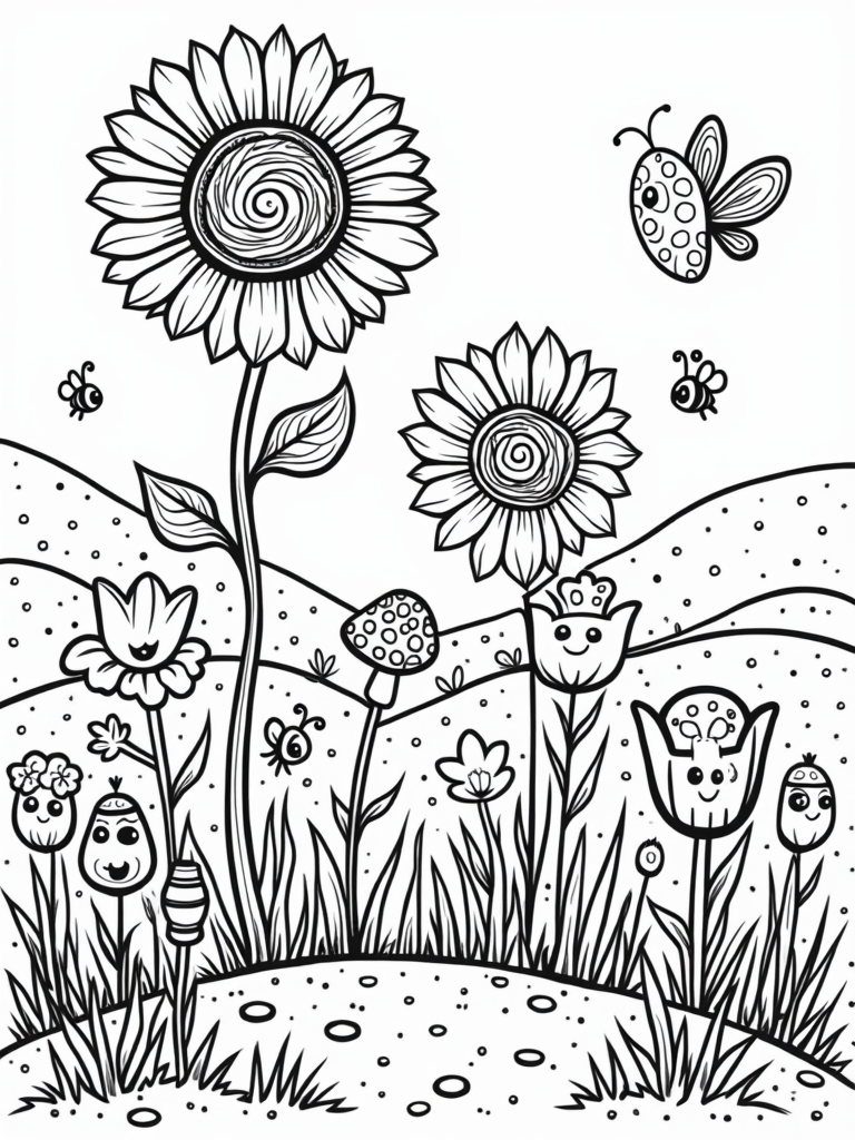 Giant Sunflower and Playful Daisies in a Flower Garden Coloring Page