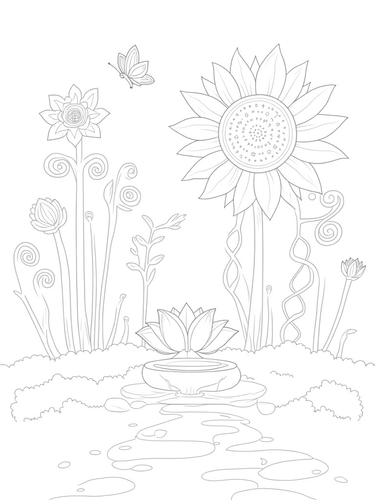 Get ready to color a magical garden filled with oversized flowers! At the heart of it all is a giant sunflower, its patterned center shining bright. Surrounding it are spiraling vines and delicate butterflies fluttering by, each with intricate wing designs. The scene is completed with a winding pebble path that leads to a beautiful fountain shaped like a blooming lotus, where water cascades gently into a pool of lily pads.