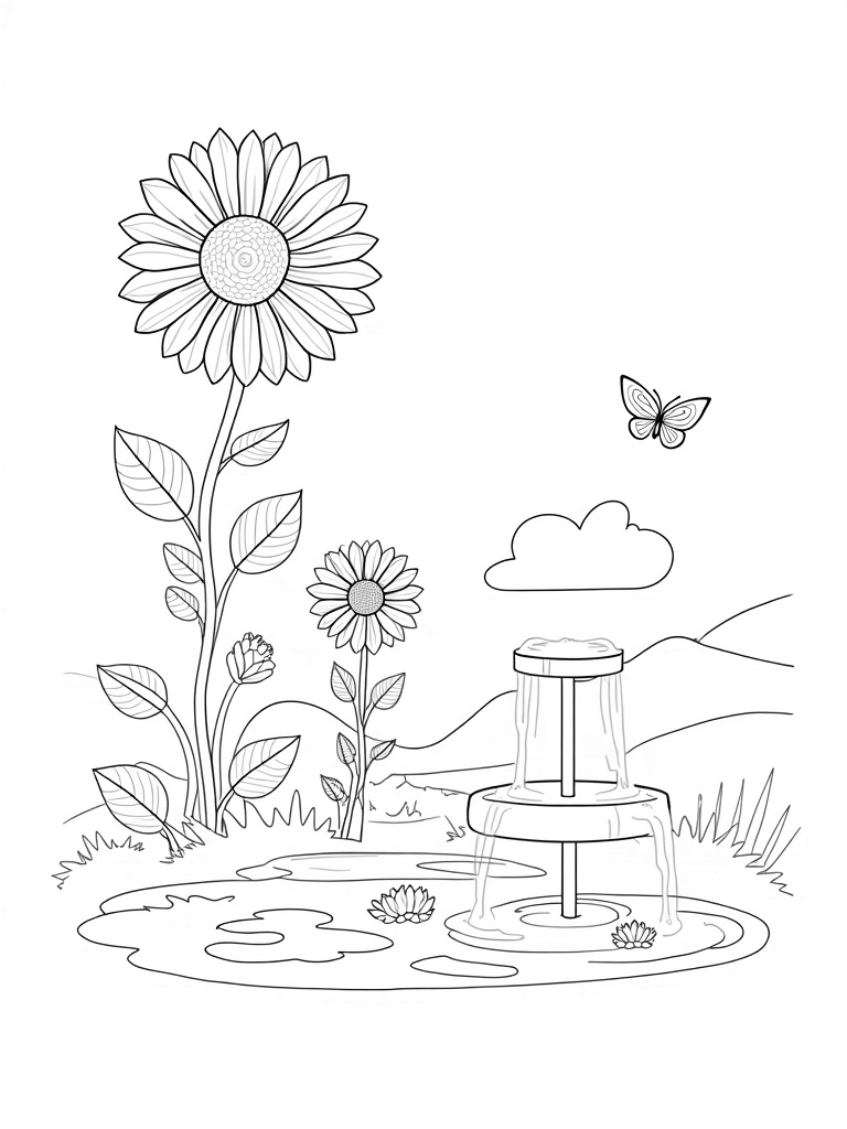 This coloring page showcases a magical garden filled with oversized flowers bursting with intricate patterns and vibrant colors. At the heart of it all, a giant sunflower with swirling seeds stands tall, surrounded by smaller daisies that each boast their own unique petal designs. A twisting vine wraps around a smooth stone fountain, where water trickles into a serene pool dotted with floating lily pads.
