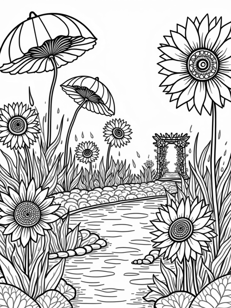 Imagine a garden where flowers are so big they can be used as umbrellas! The oversized petals create lovely shadows on the ground, making everything feel magical. Towering sunflowers twist upwards, their centers filled with swirling patterns that are just waiting for your favorite colors. Nearby, a peaceful pond reflects beautiful lotus blossoms, each one unique with its own geometric design.