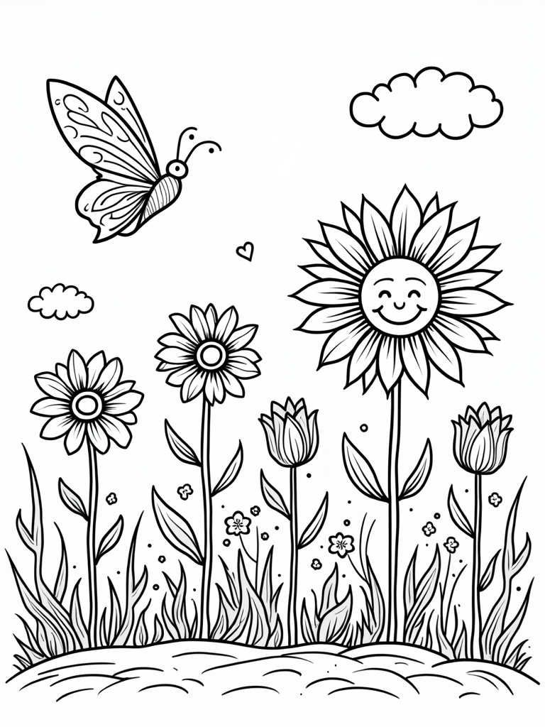 Look up, and you’ll see fluffy clouds shaped like all kinds of flowers drifting lazily by. It's like they're having their own little garden party up there! A friendly butterfly flutters between the clouds, its wings covered in swirls and dots, just waiting for some bright colors to come its way. This scene is perfect for sparking creativity!