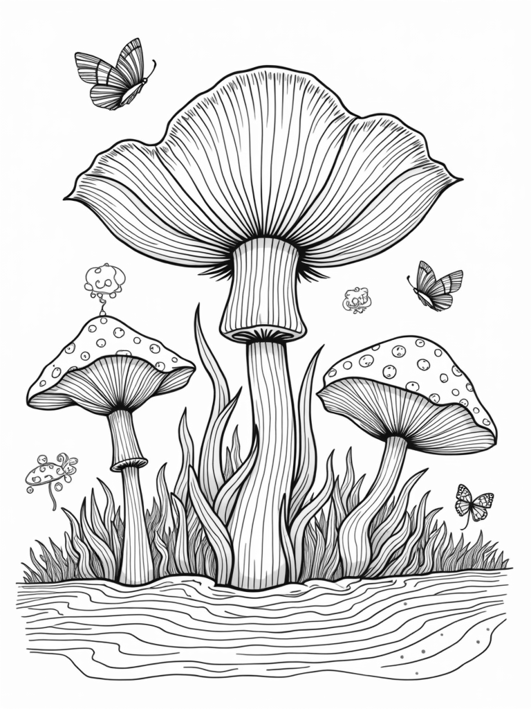 Imagine a giant flower blooming right in front of you, with its petals shaped like colorful umbrellas! Each petal is covered in intricate patterns just waiting for your creativity to come to life. Surrounding the flower, you’ll find spiraling vines playfully twisting around floating shapes that look like seeds. It’s a whimsical scene that invites you to color in every little detail.
