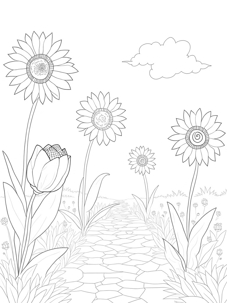 This charming garden is bursting with oversized flowers that are just begging to be brought to life with your favorite colors! The towering sunflowers reach for the sky, their spiraled centers inviting you to fill them with bright yellows and oranges. A winding cobblestone path meanders through the garden, bordered by delicate ferns and tiny daisies that add to the magical feel of this scene.