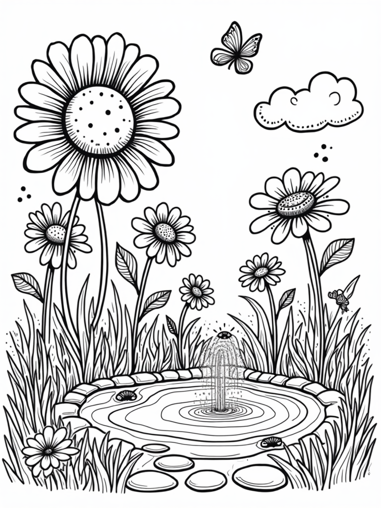 This charming garden is bursting with oversized blooms that seem to sway happily in the gentle breeze. At the heart of the scene, a tall sunflower proudly faces the sun, while playful daisies with spiral petals twirl around it in a cheerful circle. The colorful pathway made of stones invites little ones to wander through this vibrant floral paradise.