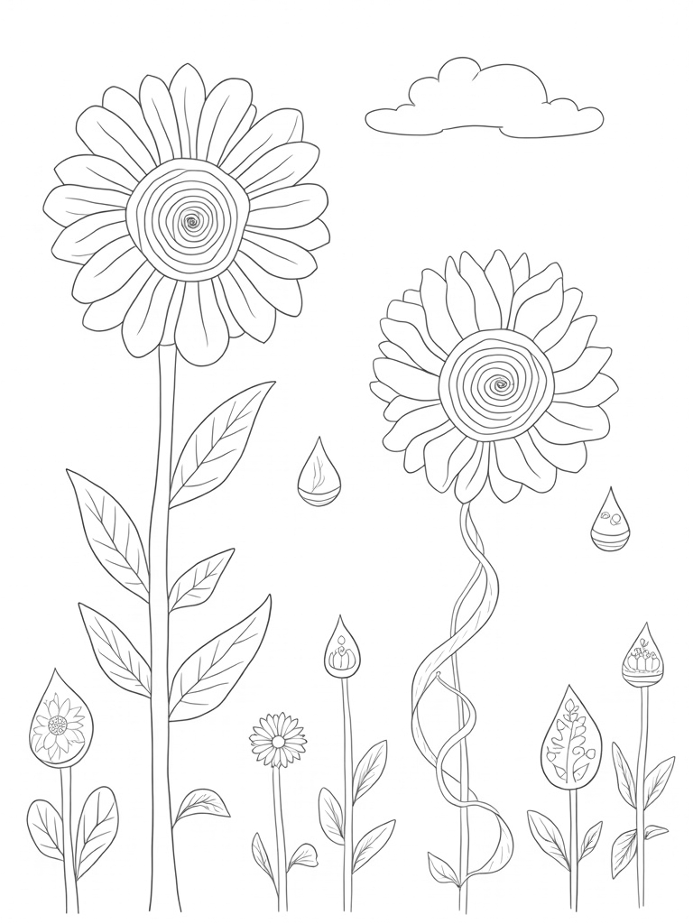 Imagine stepping into a garden where the flowers are bigger than your head! This page is filled with oversized blooms, each one sporting its own funky geometric pattern. Right in the middle, a giant daisy stands tall, and its center is packed with beautiful mandalas just waiting for some color. Nearby, a twisting vine wraps around a butterfly-shaped trellis, covered in delicate leaf designs. And if you look closely, you’ll spot abstract raindrop shapes scattered around, each hiding tiny worlds of mini flowers and plants.