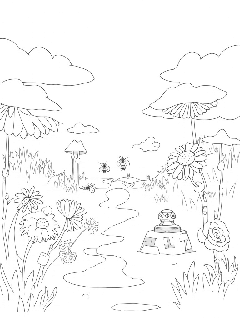 Look closely and you’ll spot giant bees buzzing around, their wings patterned with fun designs. They seem to be drawn to a delightful cluster of gear-shaped daisies nearby. These flowers are not just pretty; they add a playful twist to the garden's charm. And don’t miss the spiral vine climbing around a stone fountain that spills liquid watercolor, adding even more color to this magical place.