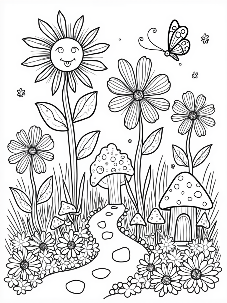 As you color in this vibrant scene, don't miss the charming mushroom house tucked away along a winding path made of colorful stones. Its door is shaped like a leafy green, making it feel extra cozy and inviting. Fluttering butterflies dance above the blooms, and a friendly bumblebee buzzes nearby, bringing the whole garden to life!