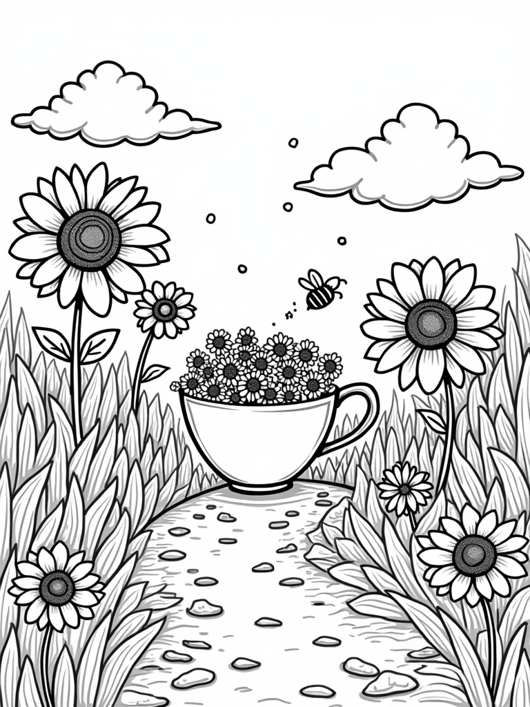 This delightful scene is all about a garden bursting with oversized flowers that are just waiting for some color! Tall sunflowers with spiraling centers stand proudly next to gentle daisies that seem to sway with the breeze. A pretty pebble path winds its way through this magical space, leading to a giant teacup made entirely of petals, spilling over with vibrant blooms.