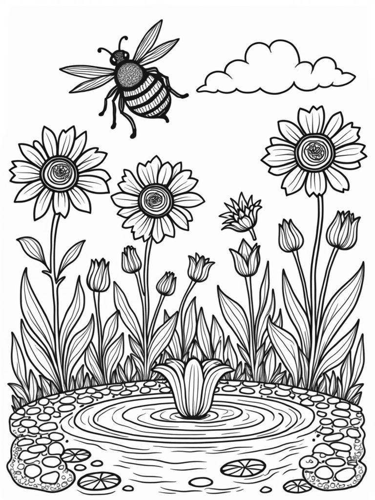 Oversized Flowers and a Giant Bee in a Whimsical Garden Coloring Page
