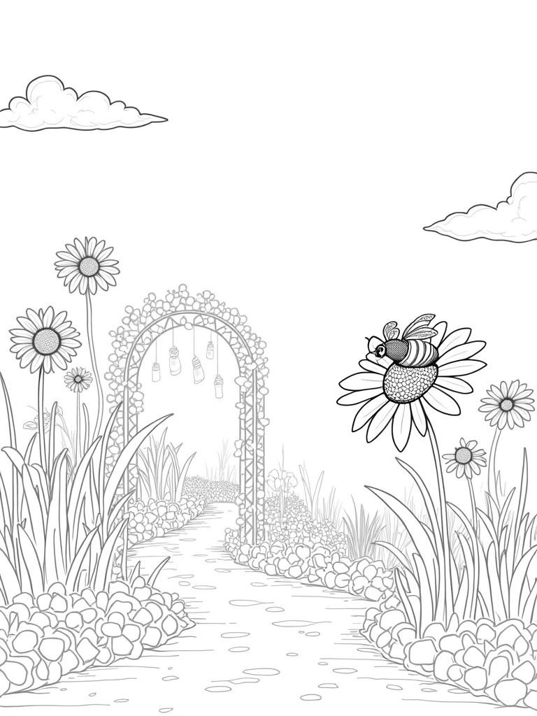 To top it all off, there’s an elegant archway made of twisting vines, full of tiny flowers that spill over the edges. It frames the scene perfectly, inviting you in to color your very own whimsical garden filled with wonder and creativity!