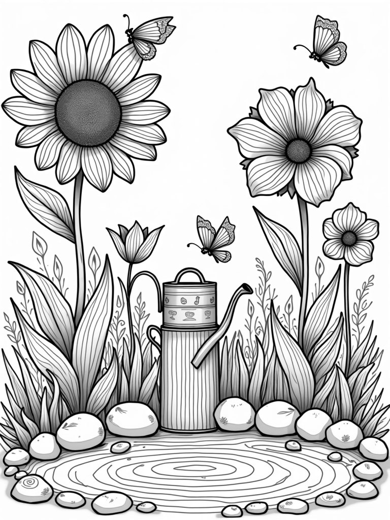 Look closely, and you'll see delicate butterflies with lace-like wings fluttering above the garden. They add a sprinkle of magic to this already charming scene. Nearby, a vintage watering can tangled in a winding vine adds a touch of nostalgia, adorned with swirls that invite your imagination to run wild. And don't forget the gentle cascade of tulips flowing into a serene pond, where scattered pebbles invite you to explore even more!