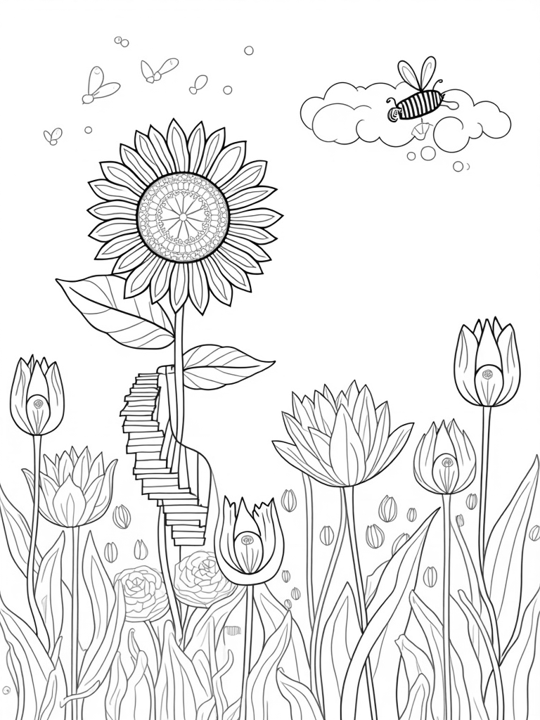 This stunning garden is bursting with oversized flowers that look like they popped out of a fairy tale! Each petal is intricately patterned, resembling beautiful stained glass. In the center, there's a gigantic sunflower with a spiral staircase winding around its stem, leading to a platform where tiny butterflies flutter around. It's a magical scene just waiting for your colorful touch!
