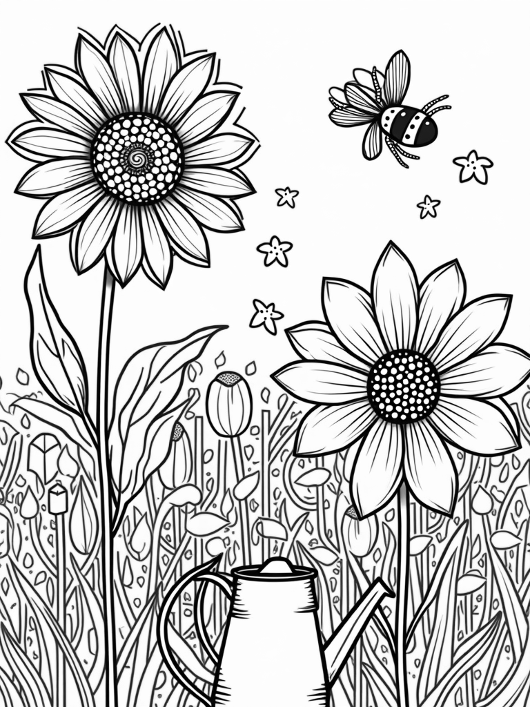 Don’t miss the giant daisy nearby, which has a mesmerizing circular pattern of spirals right in the middle. It frames a cute honeybee made of honeycomb, buzzing around as if it's on a special mission. And if you look closely, a labyrinth of leafy vines curls around a vintage watering can in the background, adding depth and a sense of mystery to this cheerful scene.