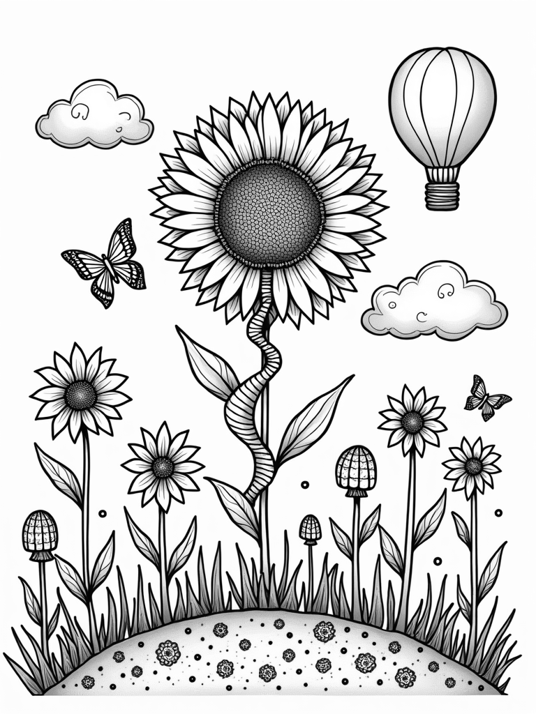 Oversized Flowers and a Towering Sunflower Coloring Page