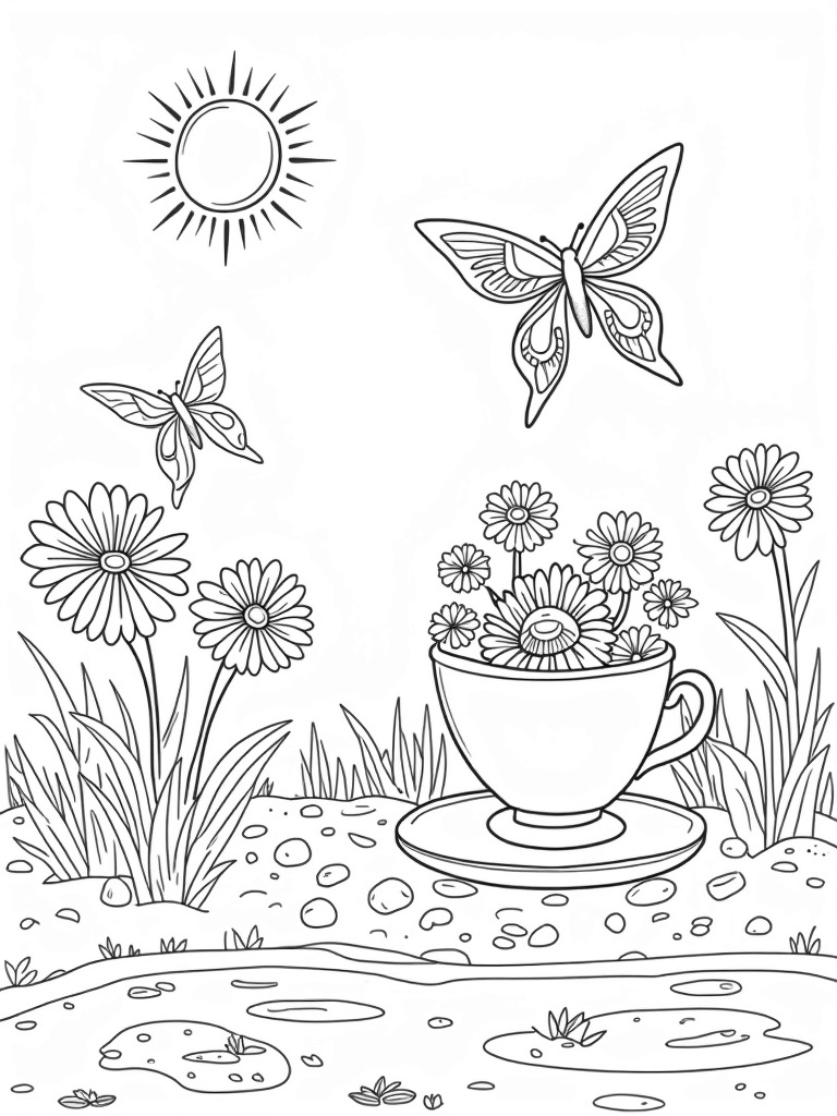 This free, printable coloring page features a whimsical garden with oversized flowers, a giant teacup planter, and playful butterflies. Perfect for kids who love to color and explore their creativity!
