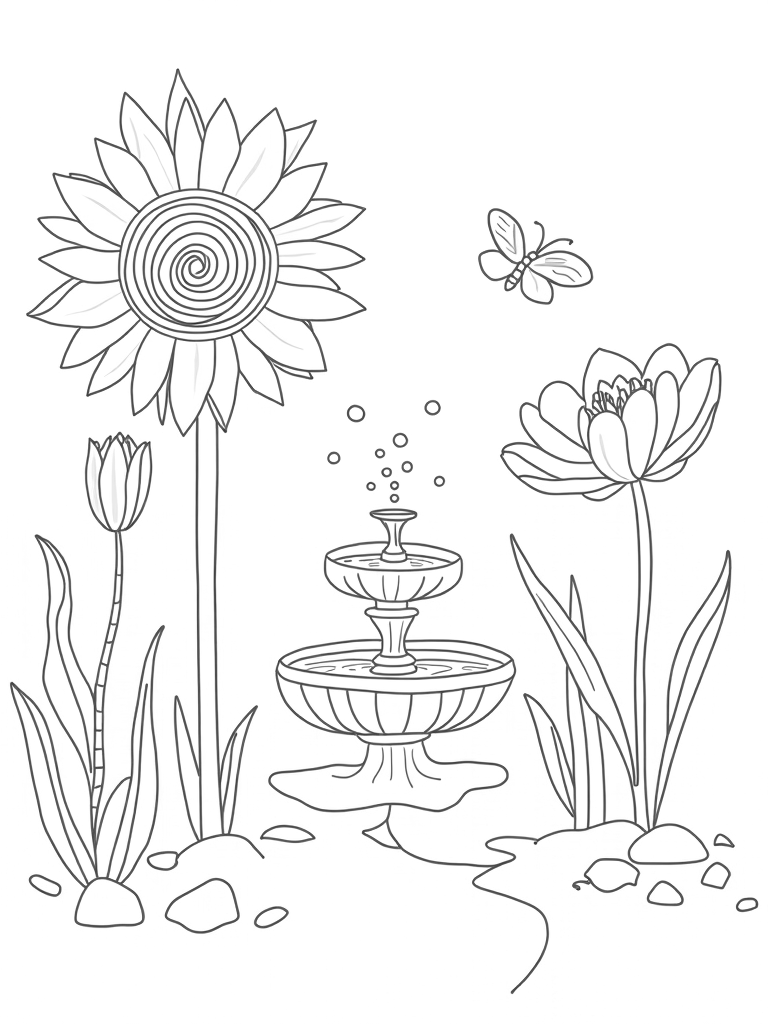 This coloring page showcases a delightful garden filled with oversized flowers in fun geometric shapes. You’ll notice a tall spiraling sunflower with petals that twist into a labyrinth pattern, making it a standout feature. Nearby, there are delicate tulips with striped stems that seem to dance around a pebble path, inviting little hands to color them in.
