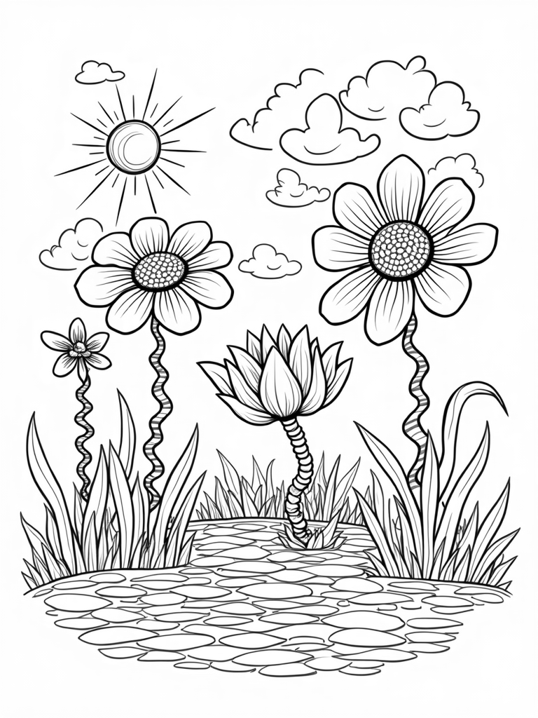 Oversized Flowers in a Whimsical Garden Coloring Page