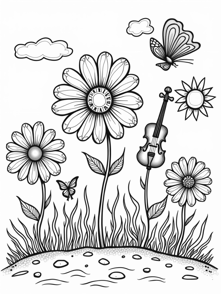 Check out this free, printable coloring page filled with oversized flowers and musical petals. It's perfect for kids who love nature and creativity. Grab your favorite colors and bring this whimsical garden to life!