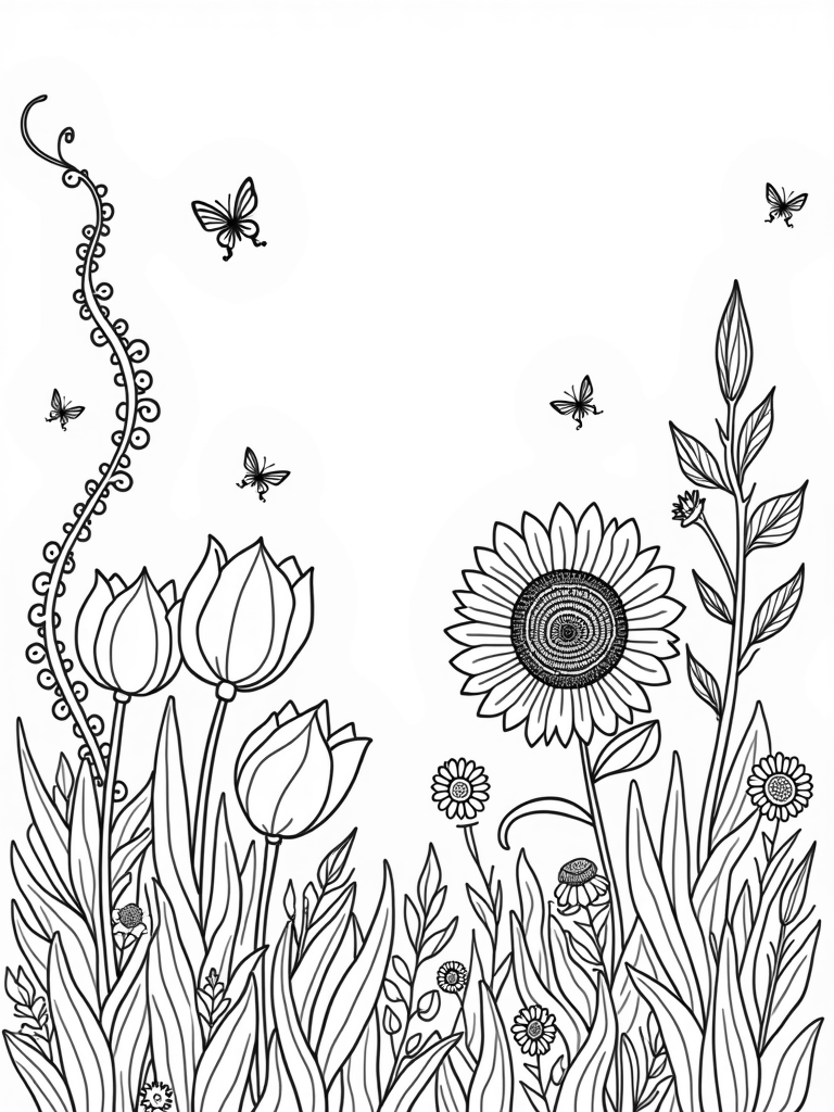 In this delightful garden scene, you’ll find oversized tulips that look like they’re bending in the breeze, almost like cheerful umbrellas! Next to them, a twisting vine climbs up, decorated with swirling leaves and pretty daisies. Right at the center is a big sunflower, showcasing a maze of patterns in its petals that you can fill with all sorts of colors.