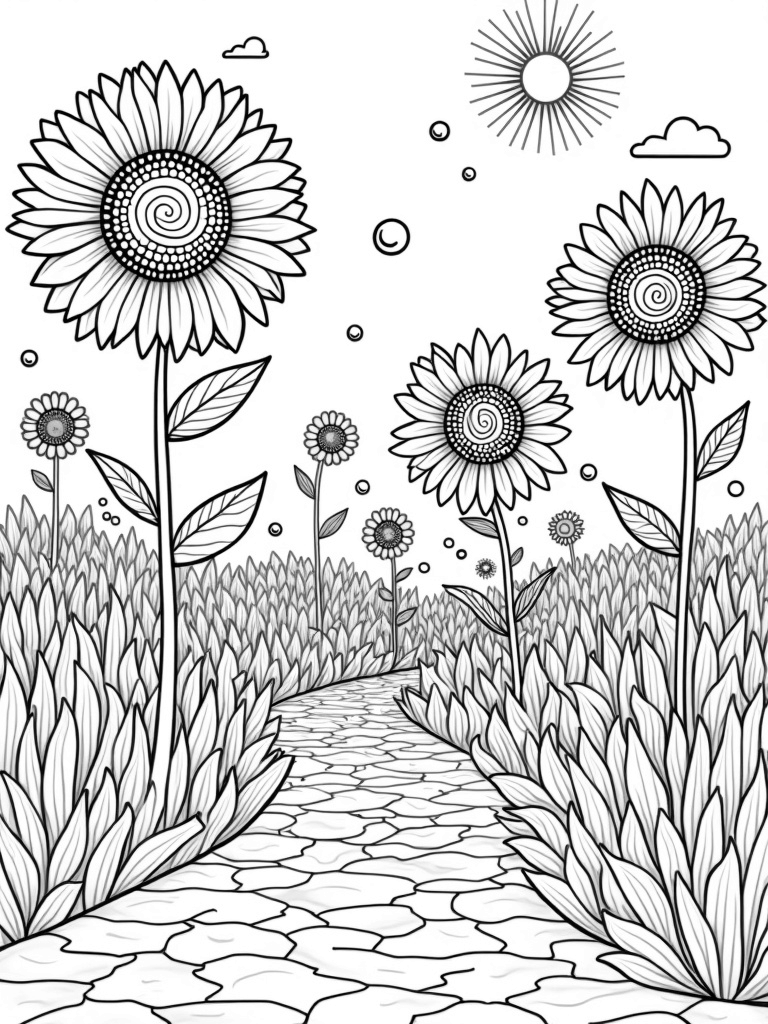 Imagine a garden where flowers are as tall as trees, each petal bursting with unique patterns just waiting for your favorite colors! A winding pathway made of colorful mosaic stones takes you through this magical space, guiding you to a giant daisy with a spiral center that’s sure to catch your eye. You’ll also spot some floating bubbles nearby, reflecting the beautiful shapes of the flowers around them.