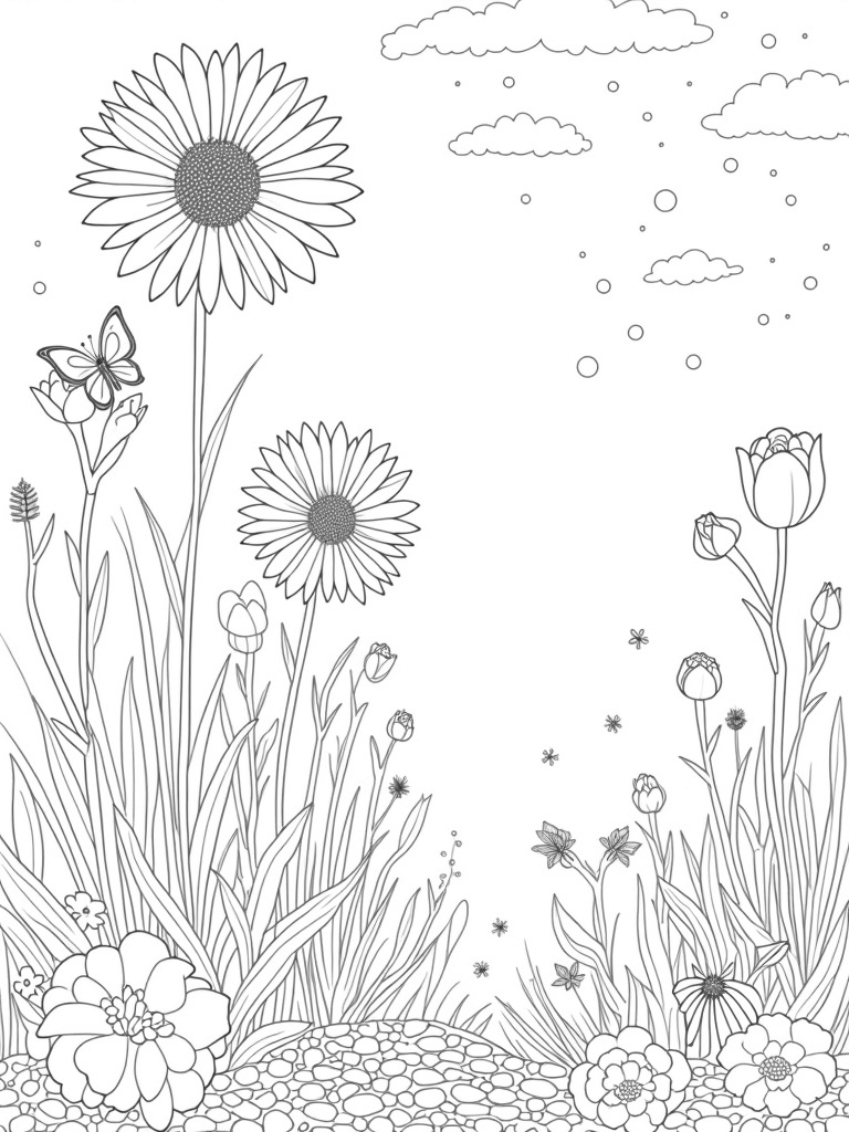 Check out this free, printable coloring page featuring a whimsical garden filled with towering flowers and a giant daisy. Perfect for flower lovers, it's a fun way for kids to get creative with colors!