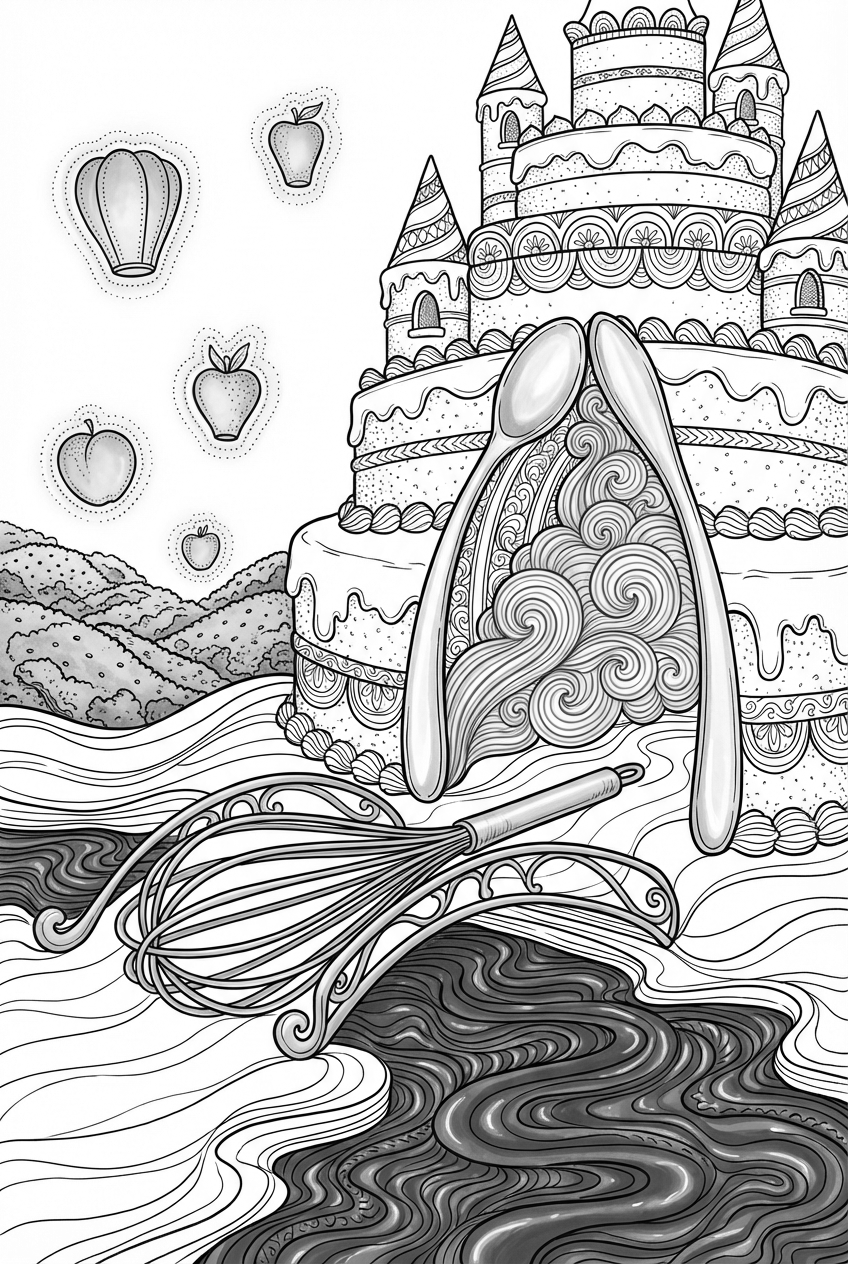 Feel free to play with pastel shades for the frosting and a rich brown for the chocolate river. Those lanterns look great in bright, fruity colors – think orange, lime, or berry. The silver spoon can be a shiny metallic gray, and the caramel clouds are perfect for soft orange‑yellow blends. Have fun mixing patterns and textures as you color!