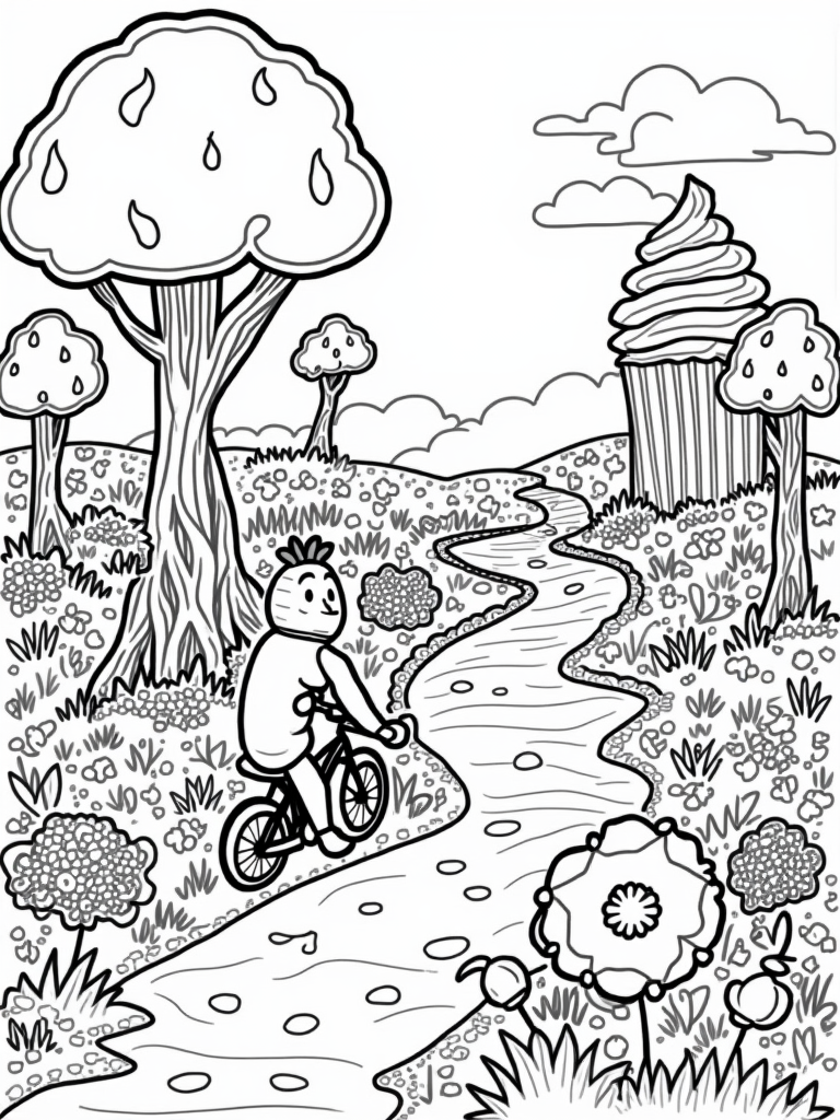Check out this free, printable coloring page featuring a whimsical fruit garden with a cheerful carrot on a bike, oversized fruit trees, and a chocolate river. Perfect for kids who love food-themed adventures!