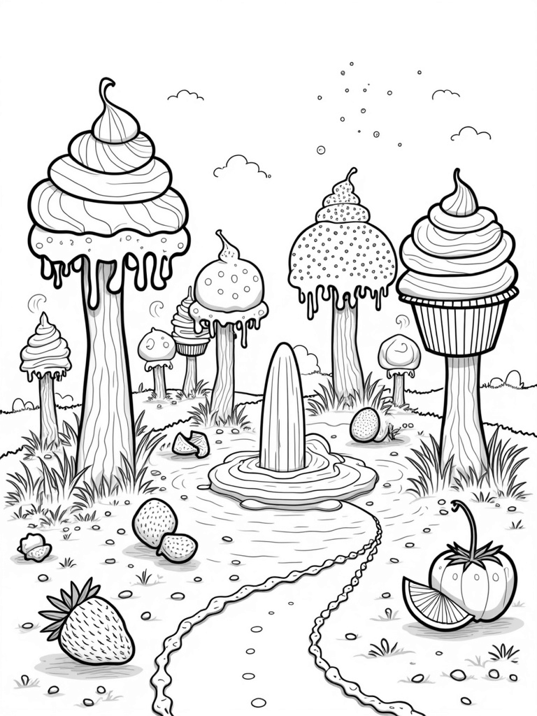 As you color, check out the oversized strawberries and lemons that float gently in the air, casting fun shadows on the grassy ground. And in the background, there’s a giant ice cream cone that stands tall like a mountain, covered in sprinkles that look like confetti. It’s a whimsical world where your imagination can run wild!