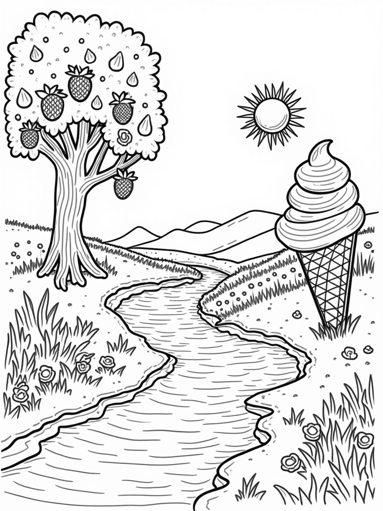 This free printable coloring page features a whimsical fruit garden with enormous strawberry trees, a flowing chocolate river, and a giant ice cream cone lookout. Perfect for kids who love fun food themes and creative coloring!